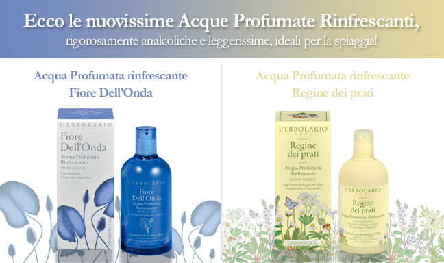 Proposte in tre diverse profumazioni, Fiore dell’Onda, Regine dei Prati e Goji. Sono l’ideale da applicare in Estate e sotto il sole in quanto non contengono alcool. Sono consigliate anche per rinfrescare la pelle durante le esposizioni solari, per cui sicure al 100%. L’acqua di Goji ha un effetto idratante ed anti-ossidante, Regine dei Prati tonifica la pelle mentre Fiore dell’Onda idrata con freschezza.