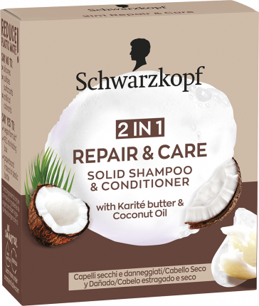 2 in 1 Repair & Care – Shampoo e Balsamo solido in una formula 2in1. Con burro di karité e olio di cocco, ripara, ammorbidisce e protegge la struttura del capello. Per capelli rigenerati, morbidi e sani. Consigliato per capelli secchi e danneggiati.