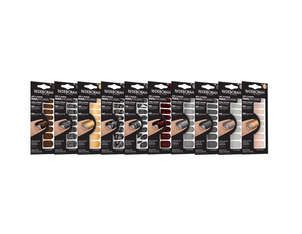 Poteva mancare Essie? La sua gamma di smalti adesivi, “Sleek Stick” Collection oltre ad avere varie colorazioni sperimenta anche differenti texture, da quelli con semplici stampe a quelli con gli strass intarsiati e declinati in 12 diversi mood. Giovani e dal finish bold sono i Nail stickers di Debby, i più glam sono a effetto specchio, dorato o argentato, dai riflessi brillanti e metallici. Facilissimi da applicare, con doppia forma, squadrata o a mandorla a seconda dei gusti e in misure diverse per adattarli perfettamente alle unghie naturali o finte. Si trovano in pratiche confezioni da 20 adesivi.