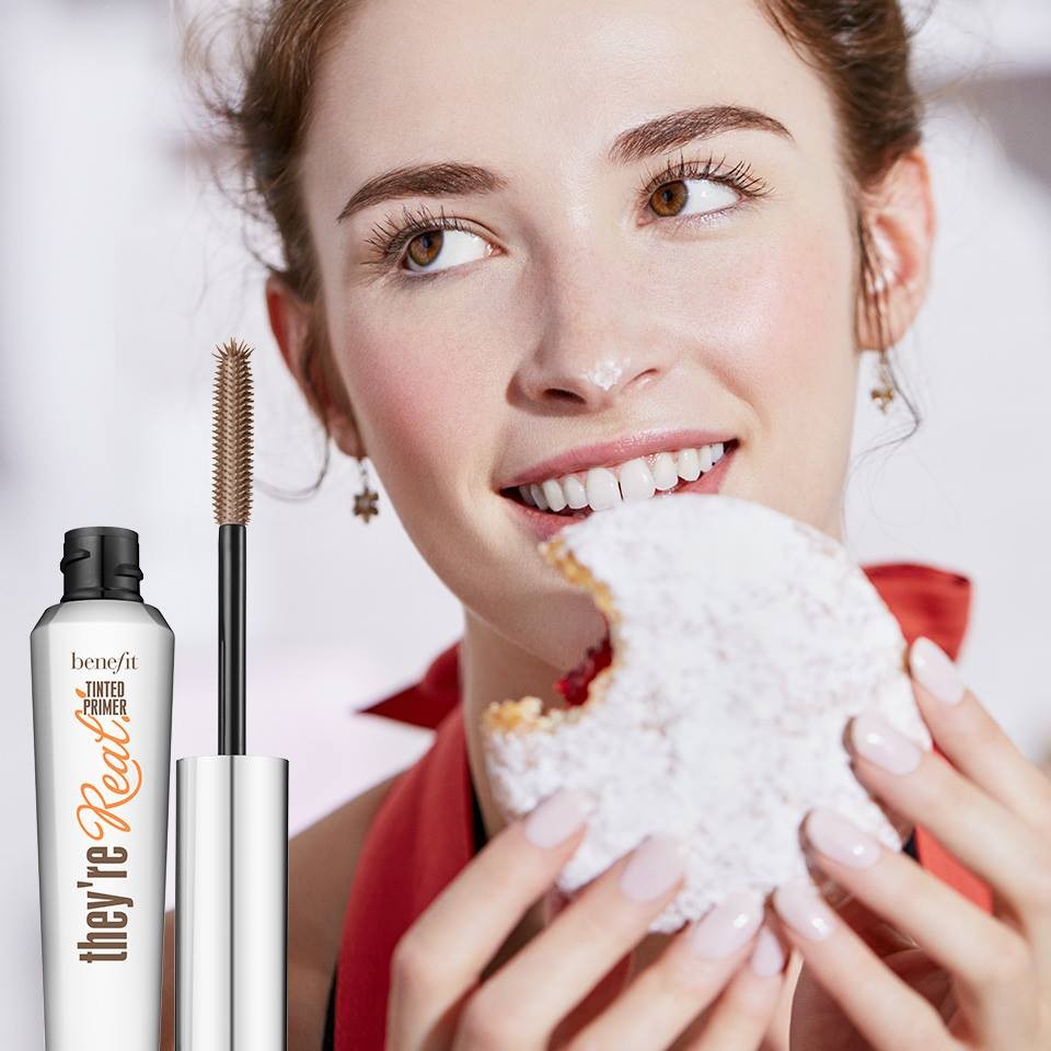 "In sequenza: ciglia senza mascara, ciglia effetto naturale applicando soltanto They're Real tinted primer e sguardo sexy con ciglia lunghissime abbinandolo a They're Real mascara" - Fonte: Pagina Facebook Benefit