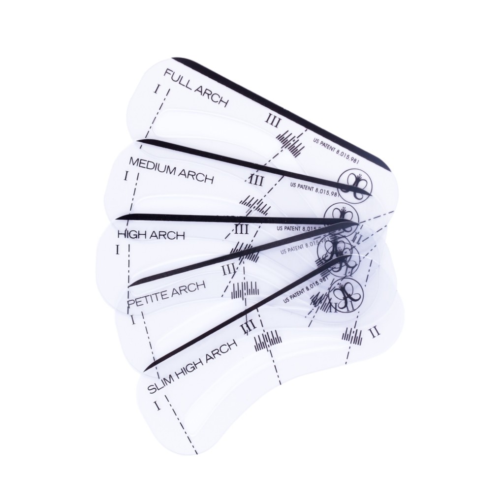 Un kit di stencil pensato per disegnare le sopracciglia in modo preciso. Grazie a questi stencil è facile scegliere e mantenere la forma di sopracciglia che più si addice alla conformazione del volto. Gli archi sono studiati in modo particolare per armonizzare il volto. Il kit contiene 5 forme diverse.