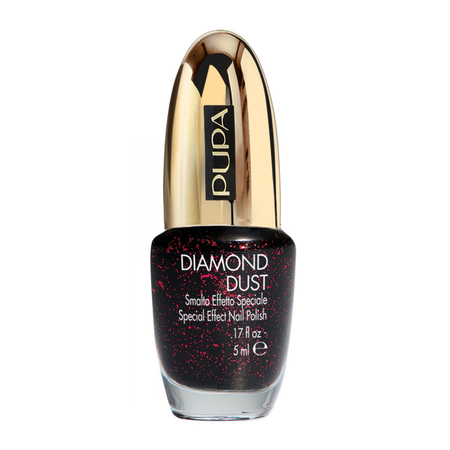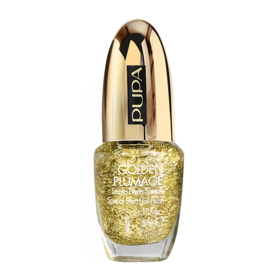 Anche Pupa ha proposto per la collezione natalizia dei Top Coat in stile gioiello: Stay Gold! Diamond Dust 001 Glowing Black presenta glitterini rossi su una base scura mentre lo Stay Gold! 001 Golden Plumage è caratterizzato da una base trasparente con paillettes dorate dalla forma allungata tipo piuma.