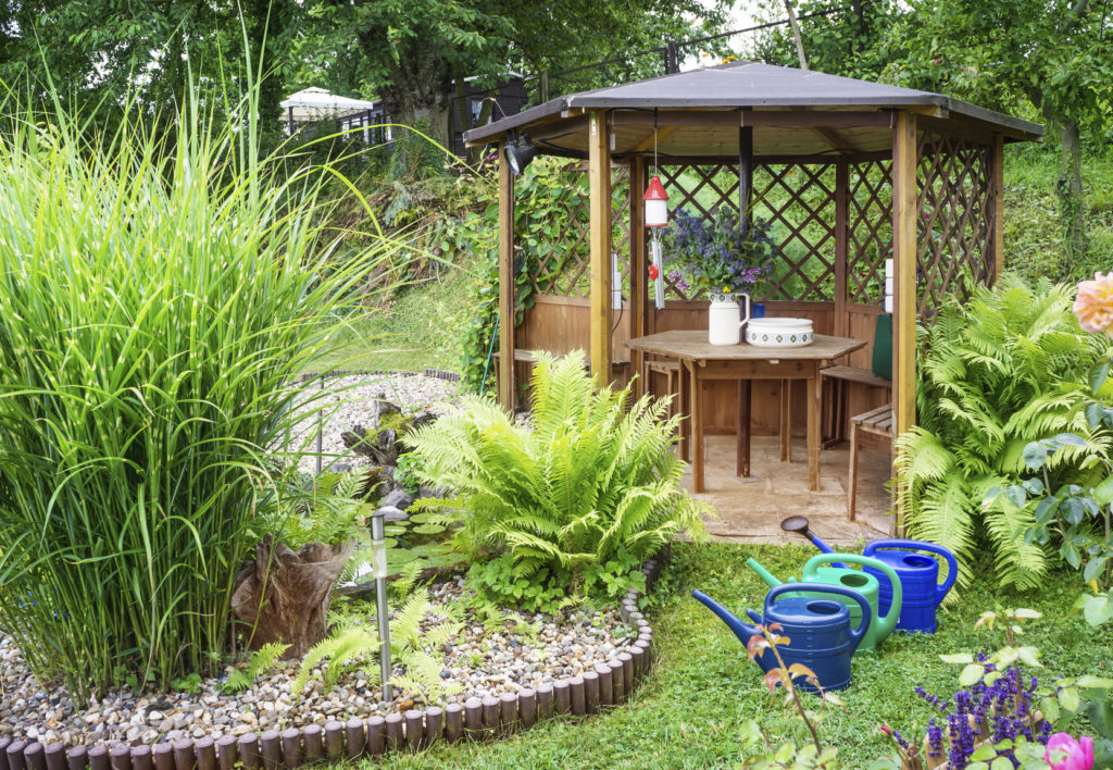 Se non abbiamo piante e arbusti sufficientemente alti e rigogliosi per garantire una zona d’ombra, è indispensabile un ombrellone, se lo spazio lo consente una di quelle strutture sostenute da un palo di legno laterale. La collocazione ideale è accanto al tavolo in modo da permettere di sostarvi anche nelle ore soleggiate. Altrimenti possiamo optare anche per una struttura a gazebo, soprattutto se per il nostro giardino abbiamo scelto un arredamento in stile orientaleggiante.