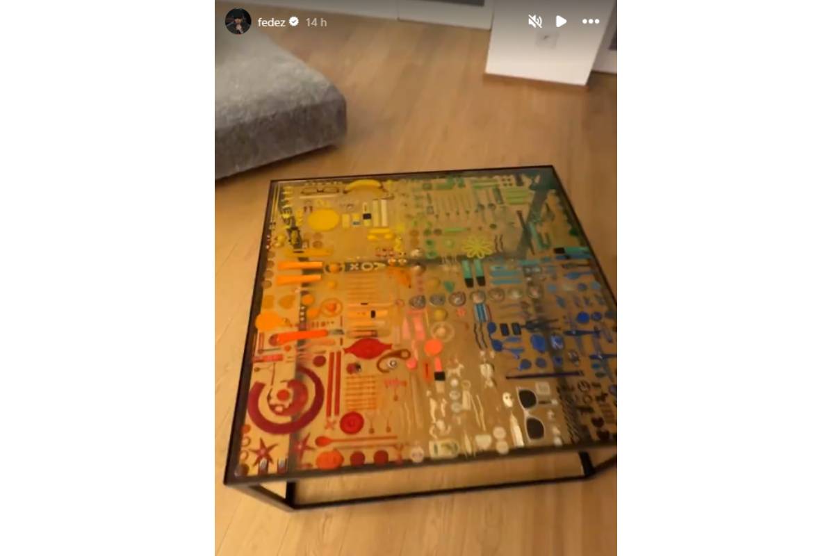 Fedez ha consiviso un video dove si vede un open space nel quale il rapper ha posizionato un grande divano grigio con davanti un tavolino molto particolare: ha il ripiano in vetro tutto decorato con immagini di banane, evidenziatori e occhiali. Molto pop.