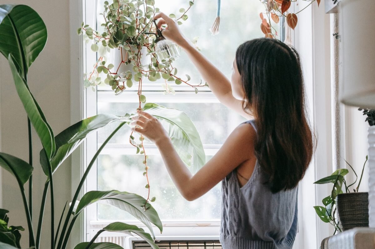 ragazza che innaffia le piante a casa