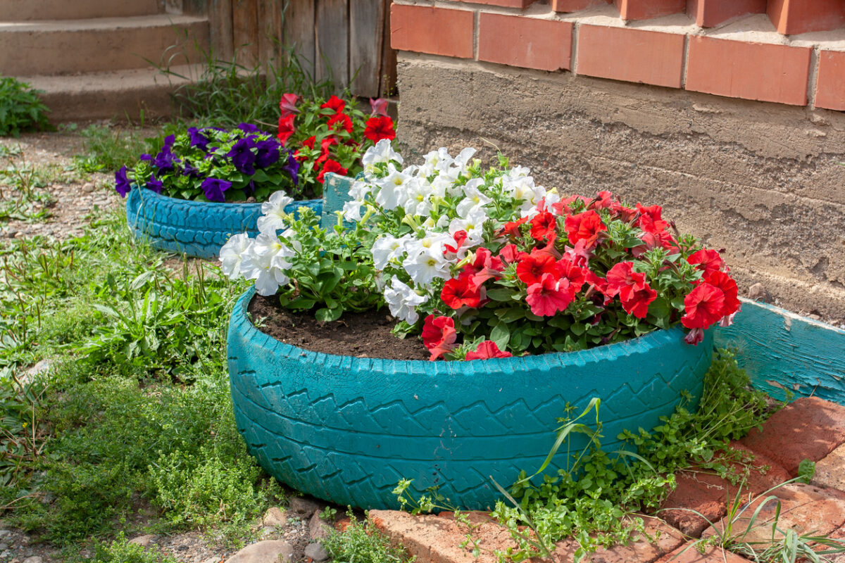 Con un po’ di fantasia qualsiasi materiale di scarto può trovare una nuova vita, un vecchio pneumatico, per esempio, può diventare una fioriera colorata.