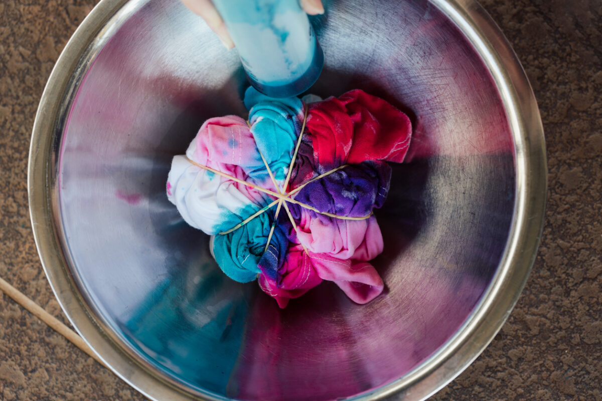 Una tecnica molto più semplice è quella dei nodi. Per realizzarla, basta torcere il tessuto nelle parti in cui si vuole che venga realizzato il disegno e tenerle ferme con dei nodi, uno spago o degli elastici. La maniera più sostenibile per realizzarlo è utilizzare uno o più colori, da diluire in acqua al posto della candeggina; non rovineranno le fibre e il risultato è più facile da controllare. Un consiglio: assicuratevi che il tessuto sia pulito e umido; una volta realizzato il disegno, vi basterà sciacquare, sciogliere i nodi e stendere il batik all’aria.