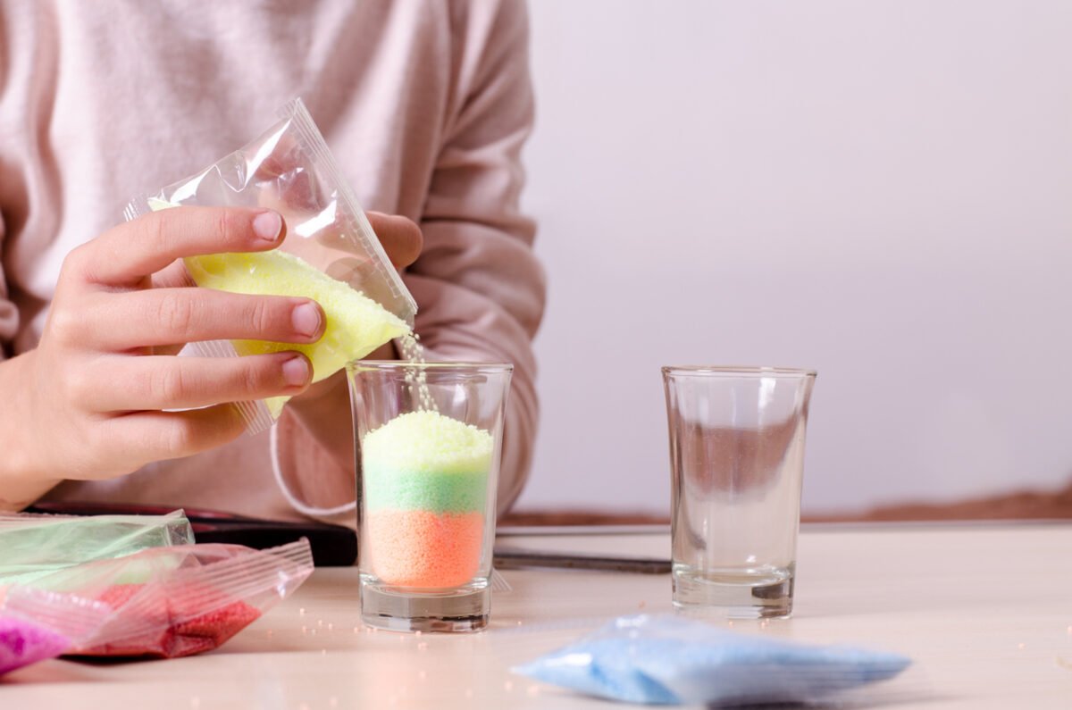 Quando la cera è ormai sciolta, unite della polvere di brillantini e 4, 5 gocce dell’essenza che avete scelto. Mescolate di tanto in tanto e rimuovete il tutto dal fuoco. La cera fusa andrà versata con attenzione all’interno del bicchiere ed in questa fase abbiate cura di versarla in modo graduale fino a raggiungere il bordo.