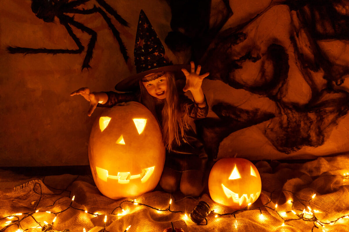 Una bambina travestita per halloween gioca con delle zucche
