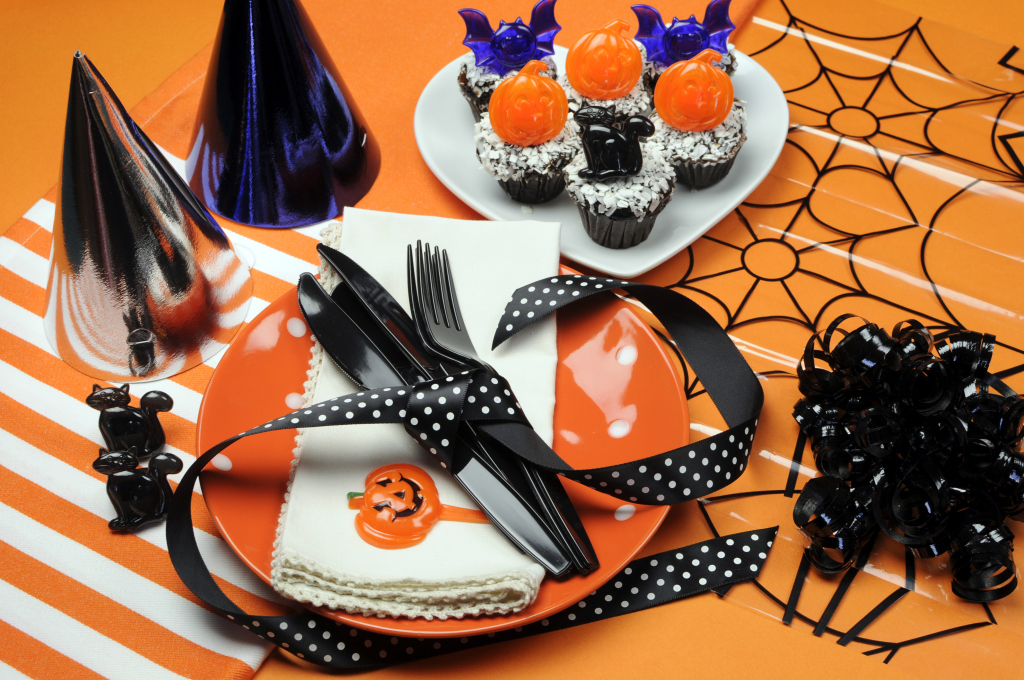 Su un tovagliato nero o viola (potete utilizzare quelli in TNT), sistemate bicchieri e piatti di carta arancioni o che raffigurino delle immagini di gatti, streghe e zombie. Legate le posate con un nastrino nero e completate con un segnaposto artigianale a tema Halloween.