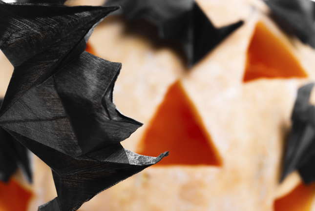 Fra le mille decorazioni di carta, con il nastro per regali provate a costruire zucche o pipistrelli origami: distribuiteli sulla tavola, o se volete supire i vostri ospiti, cuciteli su un filo di nylon… saranno impressionanti se appesi a testa in giù su mobili e finestre!