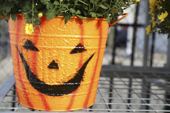 Anche i vasi da fiori potranno contribuire al vostro giardino di Halloween! Passate una mano di cementite sui vasi e dipingeteli con una vernice arancione. Con un pennello nero disegnate la forma della bocca, gli occhi e avrete il vostro vaso zucca.