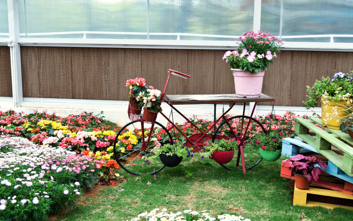 Infine, anche la vecchia bicicletta in disuso della nonna sistemata in giardino, si può trasformare in una fioriera romantica e raffinata, dispondendo una cascata di vasi e fiori in ogni spazio disponibile della bicicletta. Un tipo di allestimento rustico e in stile shabby perfetto soprattutto per i giardini di campagna.