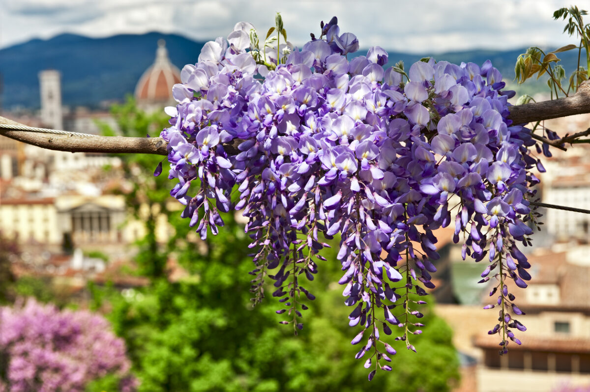 - Il glicine, dagli splendidi fiori lilla raccolti in grappoli e il portamento rampicante;
