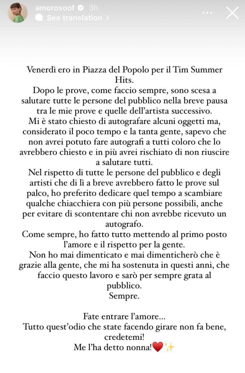 Nelle scorse ore un autografo negato da parte di Alessandra Amoroso ad una fan durante il Tim Summer Hits ha scatenato una bufera di polemiche via social. Poco fa la cantante ha deciso di intervenire dal suo profilo Instagram per esporre le sue ragioni e fare chiarezza su quanto accaduto.