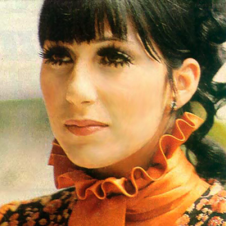 Il look mantenuto in quegli anni ricorda una Cher giovanissima: capelli folti neri e lunghi, piega rigorosamente liscia e frangia fin sotto le sopracciglia. Make up molto sobrio, caratterizzato da uno sguardo intenso: matita che contorna l’occhio, tanto mascara, labbra nude e viso luminoso.