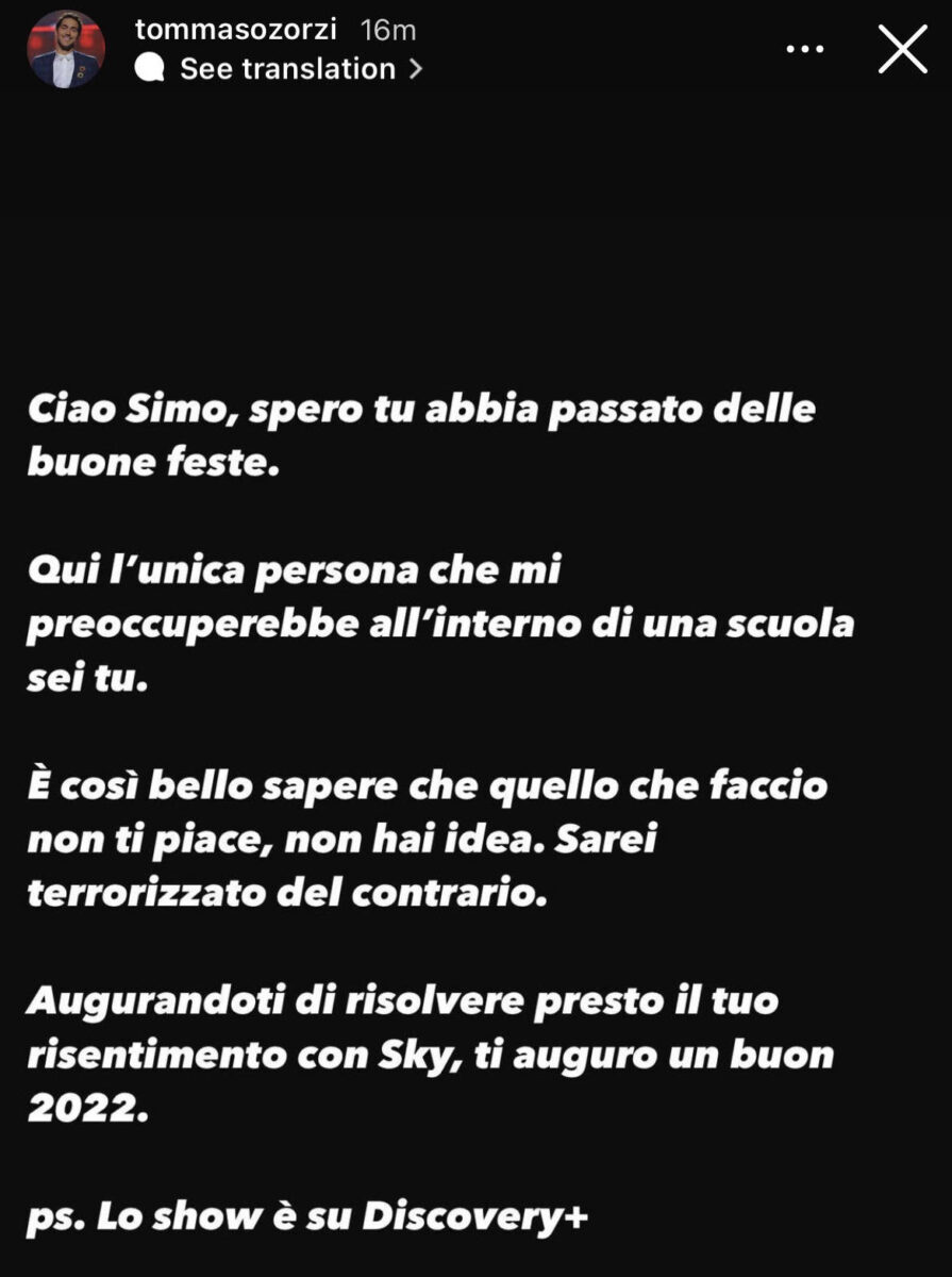 Dopo avere attaccato il programma, a rispondere dalle sue storie Instagram è stato Tommaso Zorzi, co-conduttore e giudice di Drag Race Italia insieme a Priscilla e Chiara Francini.