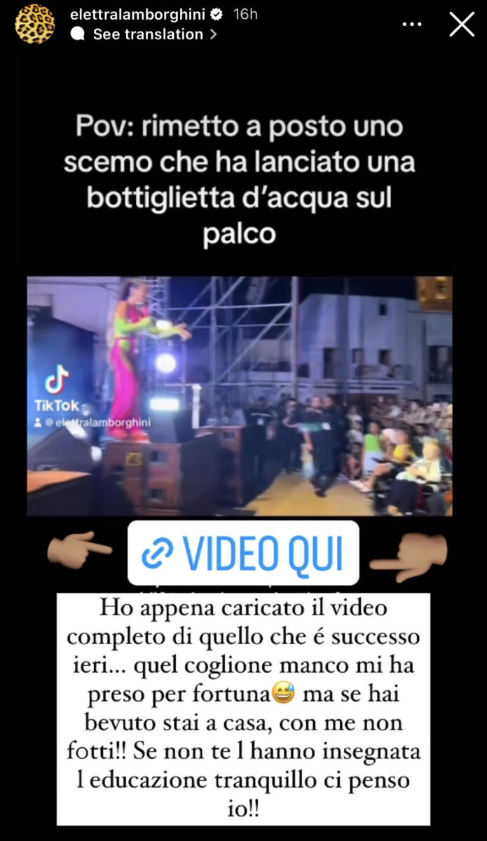 Nella serata del 4 agosto, durante il suo concerto, ci sono stati dei minuti di paura per Elettra Lamborghini. Uno spettatore ha lanciato una bottiglia verso il palco rischiando di colpire la cantante di Caramello. L’artista ha immediatamente fermato l’esibizione per rimproverare l’autore del gesto sconsiderato e nelle scorse ore, attraverso una storia Instagram, ha commentato il fatto condannando nuovamente lo sconsiderato gesto dello spettatore.