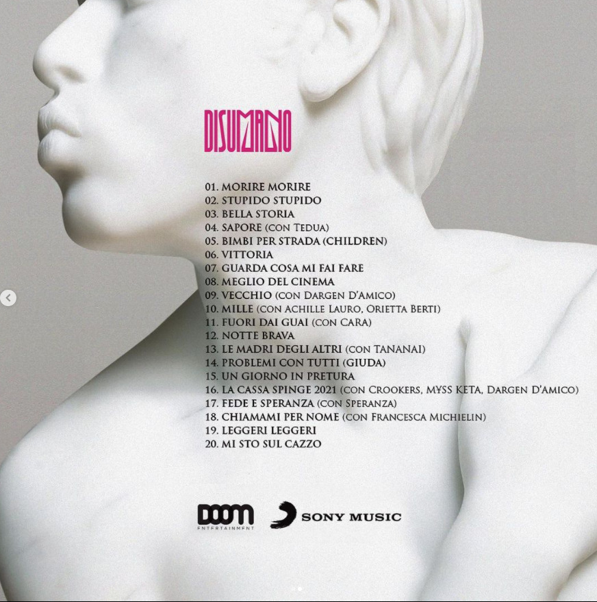 A questa, seguono altri diciannove brani che andranno a formare la tracklist del disco, ricco di collaborazioni con importanti artisti del panorama musicale contemporaneo come Myss Keta e Dargen D’Amico.