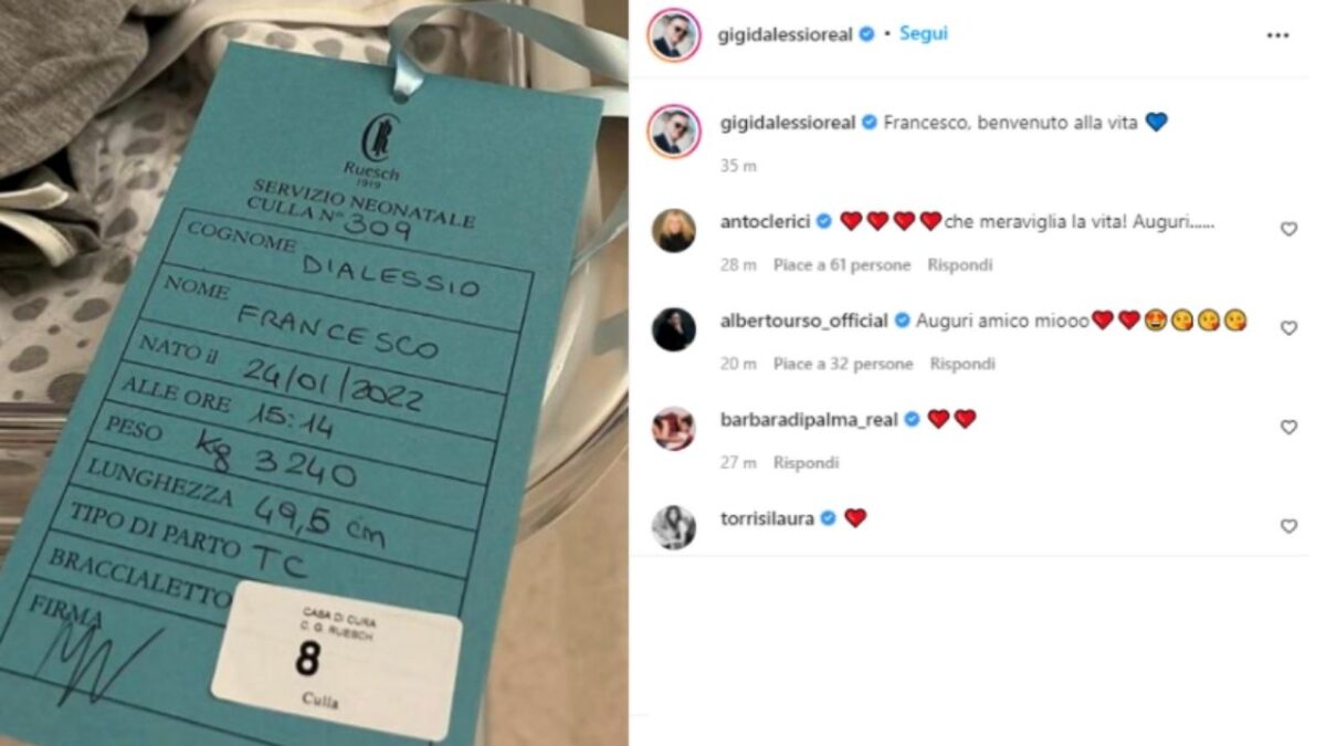Con un post pubblicato sui social, Gigi d’Alessio ha mostrato la foto del cartellino di nascita, svelando sia il nome del bambino, che si chiama Francesco, sia l’ora in cui è venuto alla luce: alle 15:14 del 25 gennaio. “Benvenuto alla vita”, ha scritto il cantante, aggiungendo un cuore blu alla descrizione del post.