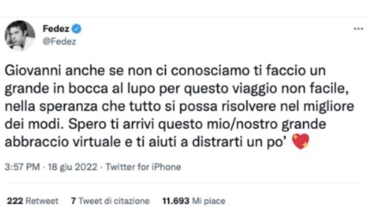 Caro Fedez, grazie infinite per il tuo affettuoso pensiero! Spero a presto, Giovanni.