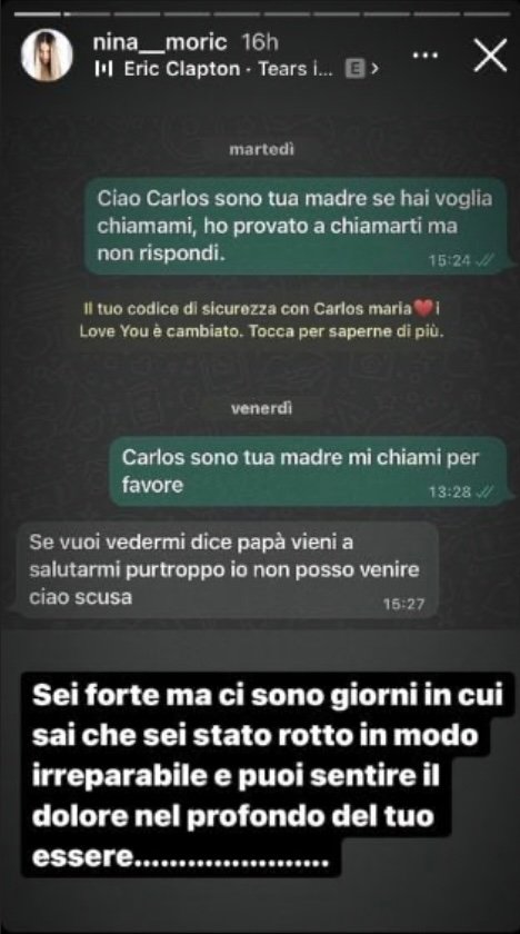 Sembra che Nina abbia più volte contattato Gabriella, nonna di Carlos e madre di Fabrizio Corona, per scoprire come stava il ragazzo ma che abbia invitato messaggi anche direttamente al 19enne che, però, avrebbe risposto di non poter andare dalla madre ma l’avrebbe invitata da lui.