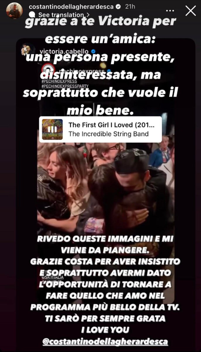 Nelle scorse ore Victoria Cabello ha ricondiviso uno dei video in cui, dopo i festeggiamenti per avere rivisto il momento del trionfo, abbraccia fortissimo Costantino Della Gherardesca, conduttore di Pechino Express. A lui infatti, è andata la dedica che la concorrente ha scritto nella sua storia: