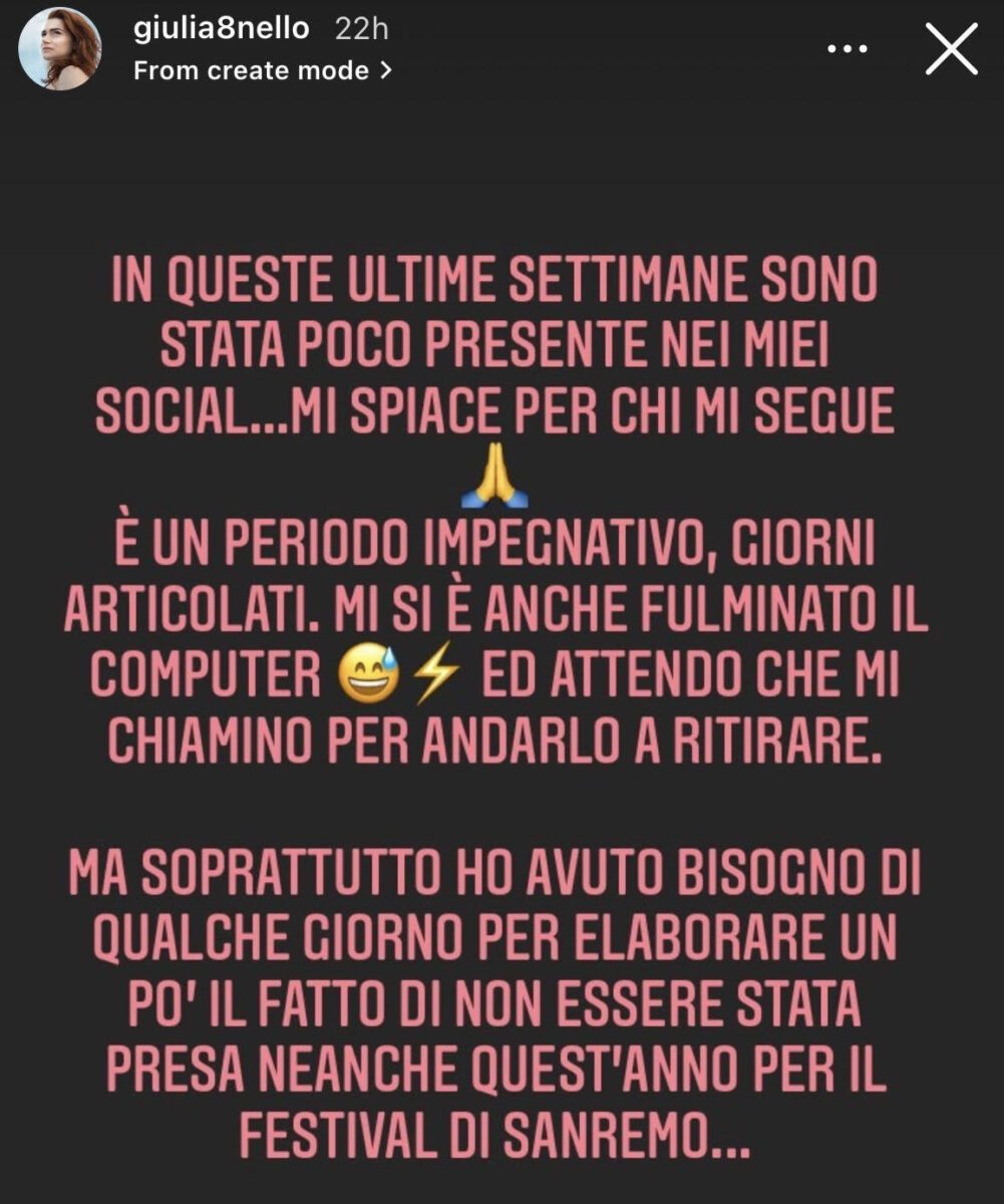 “In queste ultime settimane sono stata poco presente nei miei social… Mi spiace per chi mi segue. È un periodo impegnativo, giorni articolati. Mi si è anche fulminato il computer e attendo che mi chiamino per andarlo a ritirare. Ma soprattutto ho avuto bisogno di qualche giorno per elaborare un po’ il fatto di non essere stata presa neanche quest’anno per il Festival di Sanremo.