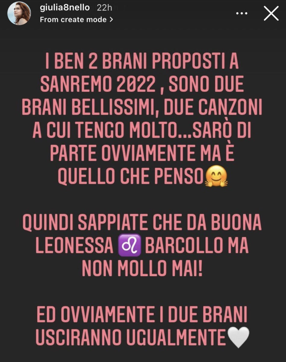 I ben 2 brani proposti a Sanremo 2022 sono due brani bellissimi, due canzoni a cui tengo molto, sarò di parte ovviamente, ma è quello che penso. Quindi sappiate che da buona leonessa barcollo ma non mollo mai! E ovviamente i due brani usciranno ugualmente.”