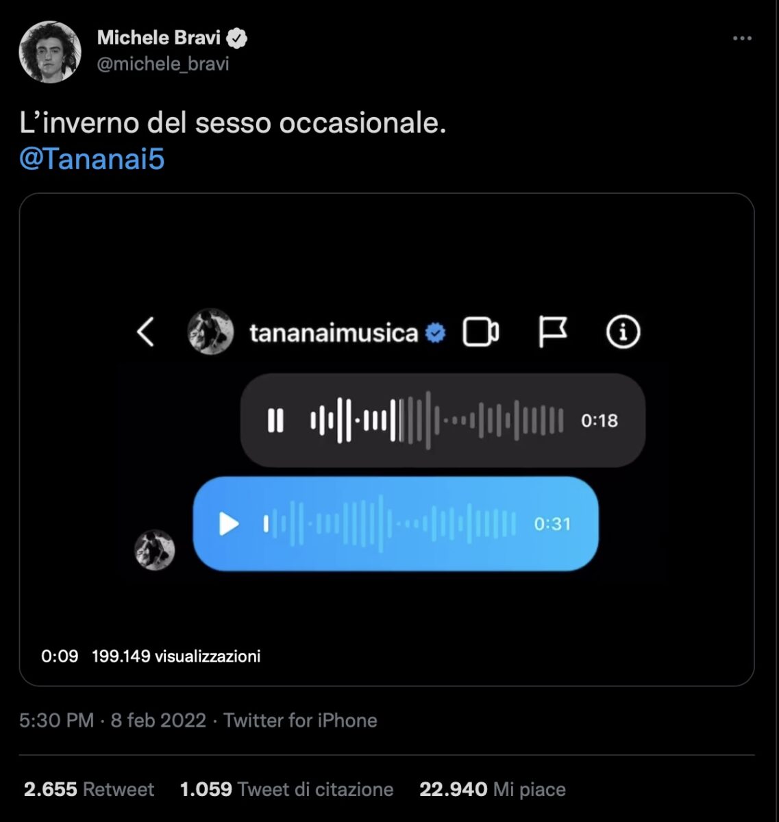 In un recente tweet pubblicato da Michele Bravi si sente un messaggio vocale che ha inviato a Tananai, anche lui sul palco di Sanremo 2022, in cui il ragazzo confessa al collega che potrebbe essere lui l’amore della sua vita.