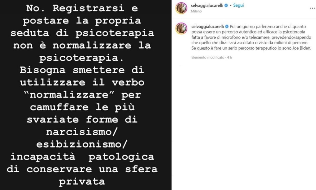 Con un post su Instagram, Selvaggia Lucarelli si è detta contraria a chi rende pubblica la propria seduta di psicoterapia. Un gesto che, secondo la giornalista, più che normalizzare la situazione, accresce il narcisismo del protagonista: