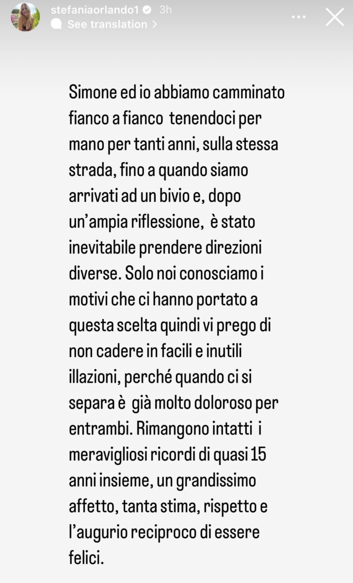 Dopo giorni di rumor su una presunta separazione tra Stefania Orlando e suo marito Simone Gianlorenzi, è arrivato in queste ore il comunicato ufficiale condiviso su Instagram dalla showgirl e cantante: