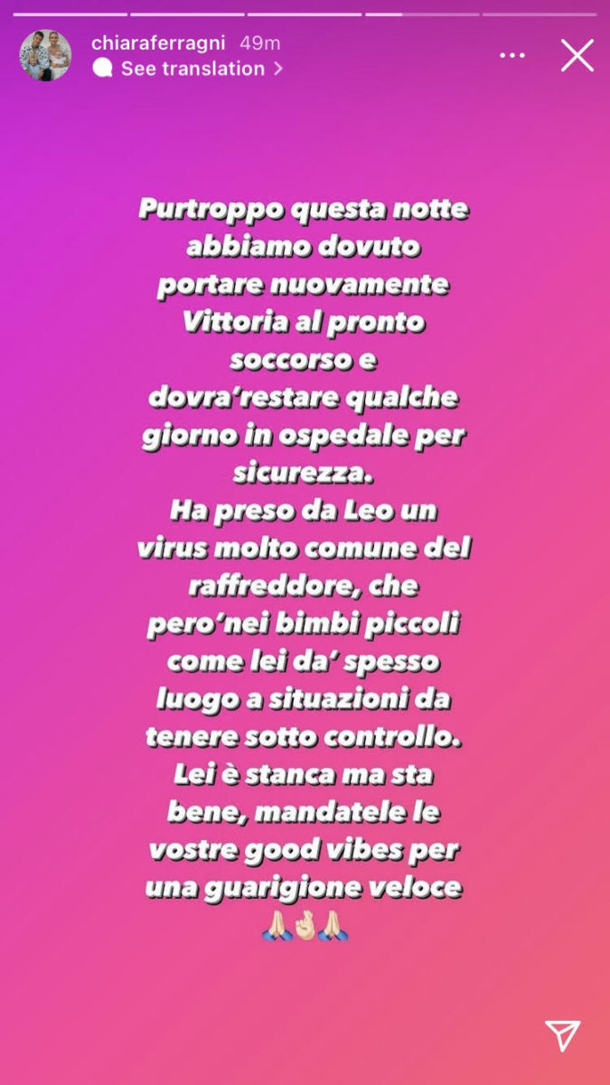 In questi giorni la piccola Vittoria è in ospedale a causa di un virus molto frequente tra i bambini, ma che va tenuto sotto osservazione. Chiara Ferragni, dal suo profilo Instagram, ha ringraziato tutte le persone per l’affetto dimostrato in queste ore.