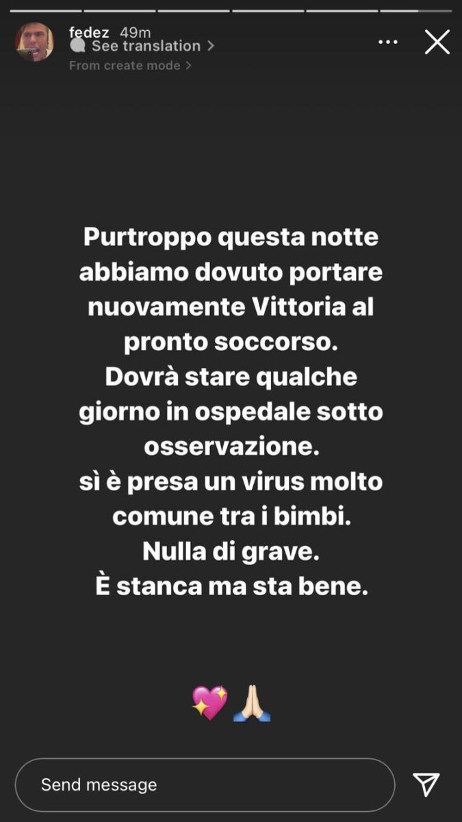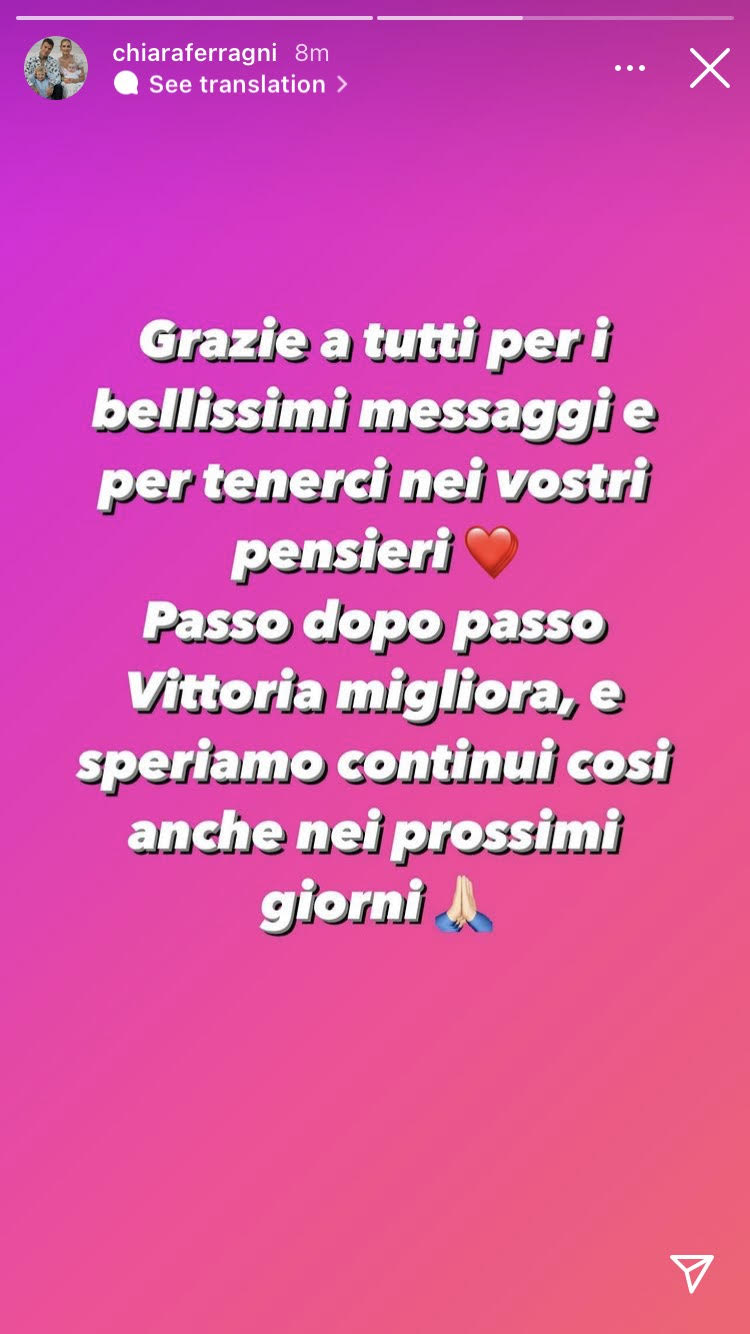 “Grazie a tutti per i bellissimi messaggi e per tenerci nei vostri pensieri. Passo dopo passo Vittoria migliora, e speriamo continui così anche nei prossimi giorni.”