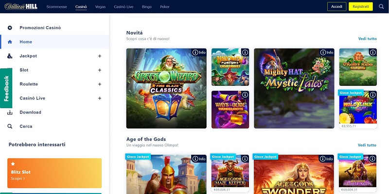 Uno dei punti forti del sito di William Hill Casino è sicuramente la sua ampia selezione di giochi. Abbiamo, per esempio, la sezione di scommesse, casinò, casinò live, bingo, poker, jackpot, giochi da tavolo, e slot machine.