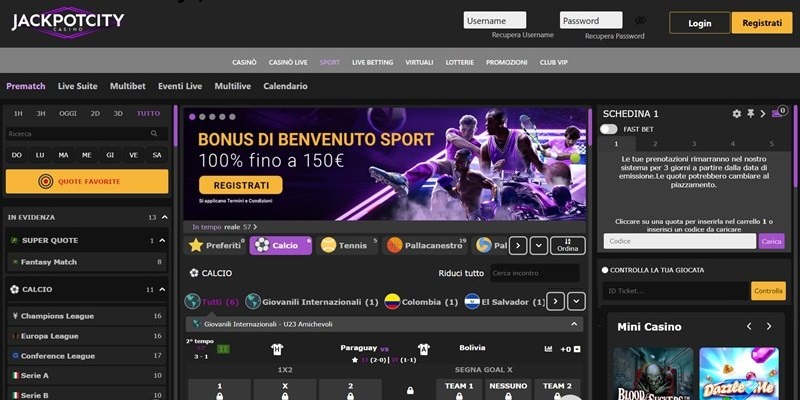 Jackpot City: scommesse live al top. Bonus di benvenuto del 100% sul primo deposito, fino a 150€. Catalogo con 19 sport, ed un buon bonus multipla.