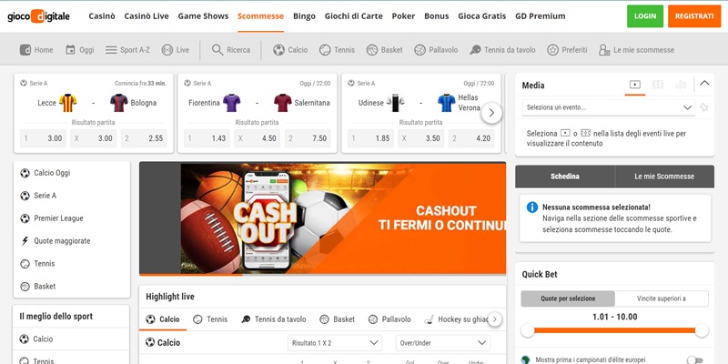 Gioco Digitale: miglior palinsesto tra i migliori siti scommesse online in Italia. Bonus di benvenuto da 5€ per le scommesse e 5€ extra per il bingo. Bouquet con 21 sport.