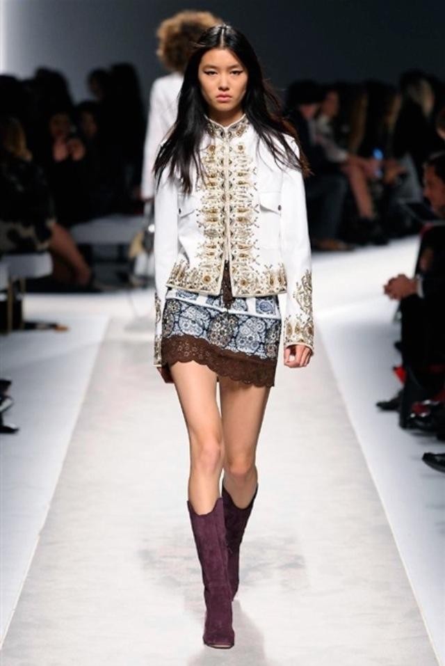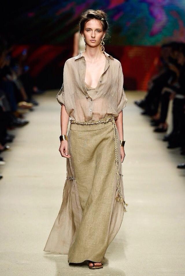 Guerriera come le amazzoni di Mad Max, eterea come le vergini che fuggono da un destino di schiavitù e sottomissione, intensa e amorevole come una madre, la sua donna indossa short, bluse e minidress con motivi tribali e lunghe code di tulle, tuniche movimentate da un gioco di trasparenze ed eleganti abiti da sera la cui palette di colori spazia dall’ocra al bianco, dal viola all’arancione, dal tortora al nero.