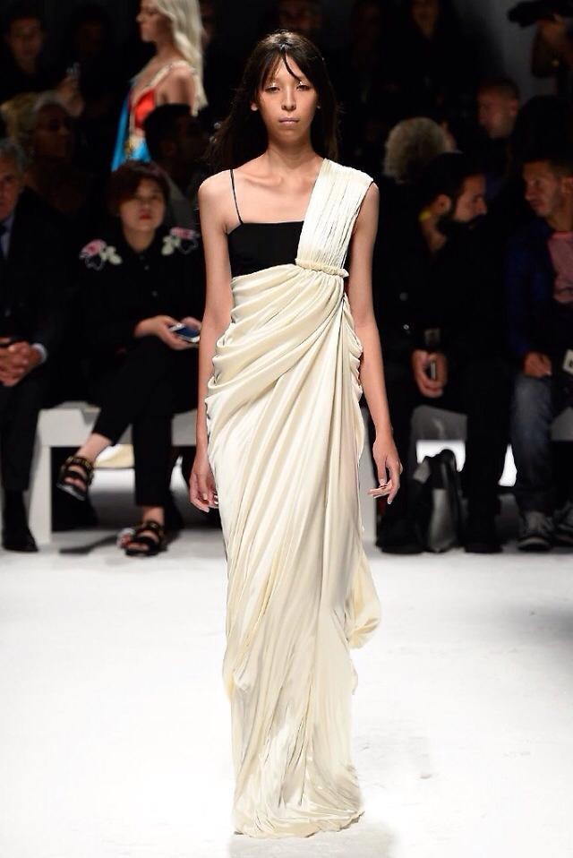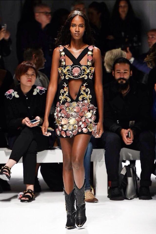Un mood sospeso tra storia e divino che attraversa anche la collezione SS 2016 di Fausto Puglisi. Drappeggi, decori di conchiglie e fasce definiscono vestiti, gonnellini e top che sembrano arrivare direttamente dall’Antica Grecia e da Roma, mentre giubbotti di pelle e borchie aggiungono un irriverente e graffiante tocco ribelle.