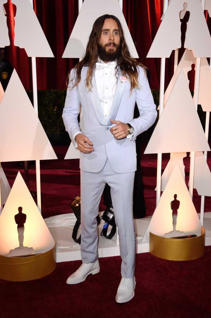 Impossibile concludere la “disamina” sui look degli Oscar senza almeno uno sguardo ai vestiti di lorsignori. E come lo scorso anno, anche questo Jared Leto finisce con l’essere protagonista. Anche se in negativo. L’attore premiato nel 2014 per Dallas Buyers Club ha scelto infatti un completo lilla customizzato di Givenchy che, come ha fatto notare qualche critico, è l’abbigliamento ideale… per il caro estinto. Il mattatore della serata, Neil Patrick Harris, invece, ha convinto in tutti i cambi look – anche quando è salito sul palco in mutande in omaggio a Birdman – a partire dal tuxedo grigio con il quale si è presentato sul red carpet insieme al compagno, così come Micheal Keaton e Alejandro González Iñárritu, impeccabili in nero, e il vincitore dell’Oscar come migliore attore protagonista, Eddie Redmayne, che ha optato per un completo blu elettrico. Menzione d’onore per il migliore attore non protagonista, J.K. Simmons, che è arrivato sul red carpet in smoking con panciotto da cui spuntava la catena dell’orologio e Borsalino.