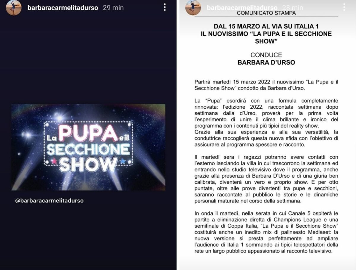 “La Pupa esordirà con una formula completamente rinnovata: l’edizione 2022, raccontata settimana dopo settimana dalla D’Urso, proverà per la prima volta l’esperimento di unire il clima brillante e ironico del programma con i contenuti più tipici del reality show”.