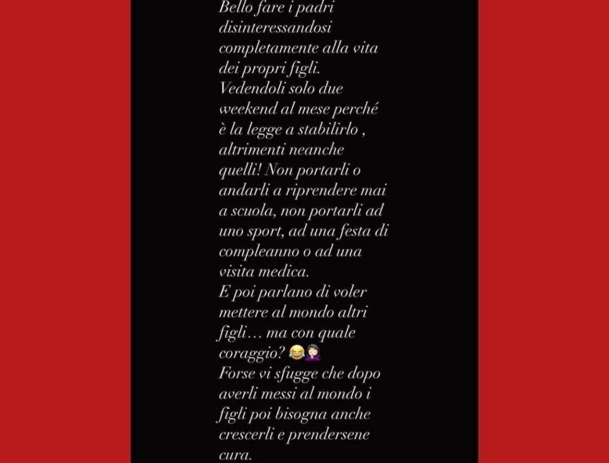 Bello fare il padre disinteressandosi completamente della vita dei propri figli. Vedendosi solo due weekend al mese perché è la legge a stabilirlo, altrimenti nemmeno quelli. Non portarli o andarli a prendere a scuola, non portarli ad uno sport, ad una festa di compleanno o a una visita. E poi parlano di voler mettere al mondo altri figli… Ma con che coraggio?