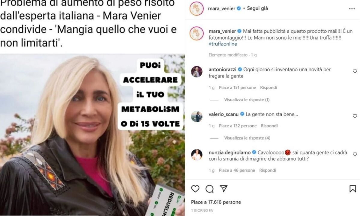 Tantissimi i commenti arrivati dagli amici di Mara Venier, che hanno subito capito la gravità della situazione. “Sai quanta gente ci cadrà con la smania che abbiamo tutti di dimagrire”, ha scritto l’ex parlamentare Nunzia De Girolamo. “La gente non sta bene…”, ha sottolineato Valerio Scanu, incredulo di fronte a quello che è stato raccontato dalla conduttrice. Fortunatamente Mara Venier se n’è accorta in tempo: agirà anche per vie legali contro chi ha usato la sua immagine in maniera impropria?