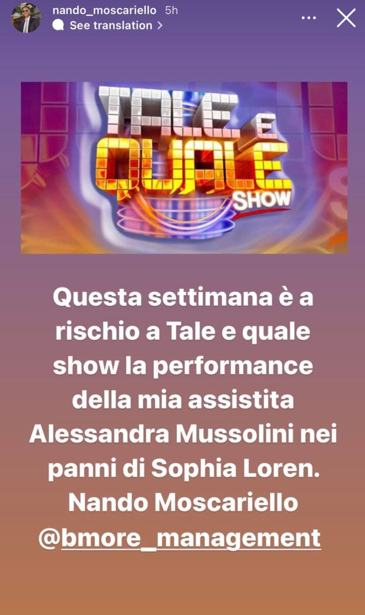 Negli scorsi giorni Nando Moscariello, manager di Alessandra Mussolini, aveva fatto sapere via social che la sua assistita avrebbe potuto non presentarsi alla quinta puntata di Tale e Quale Show.