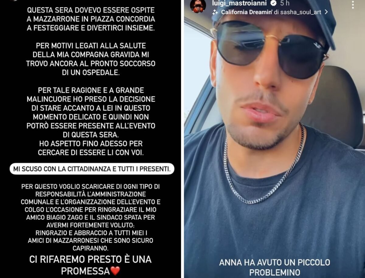 Luigi Mastroianni, con una storia su Instagram, aveva annunciato che ieri sera non sarebbe stato presente all’evento in programma, spiegando che sarebbe rimasto accanto alla sua compagna Anna, che aveva bisogno di lui: