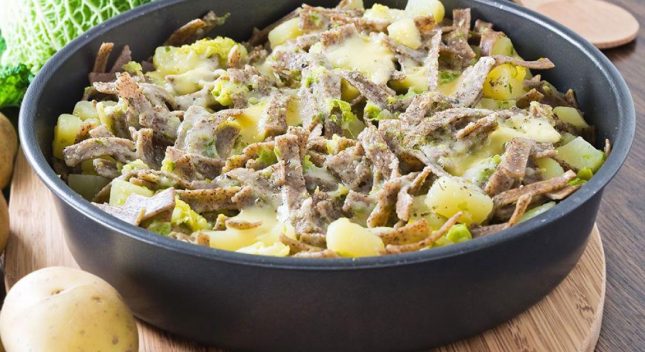 Le caratteristiche tagliatelle di colore grigio-marrone sono ottenute dall’impasto di farina di frumento e farina di grano saraceno.