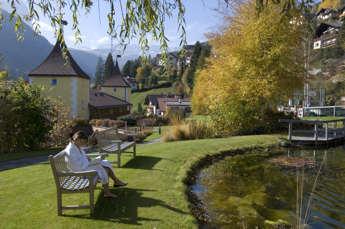 Tornando in patria, a San Viglio di Marebbe (Bolzano), all’hotel Excelsior Dolomites Life Resort, la vetrata della sauna offre uno spettacolo meraviglioso sulle montagne e sui tetti delle case del borgo.