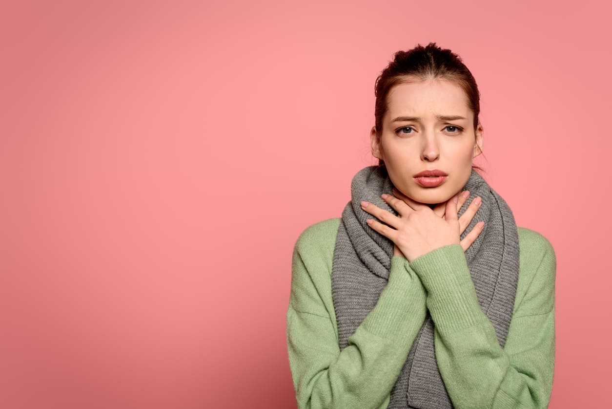 Young woman touching painful neck, sore throat for flu, cold and infection