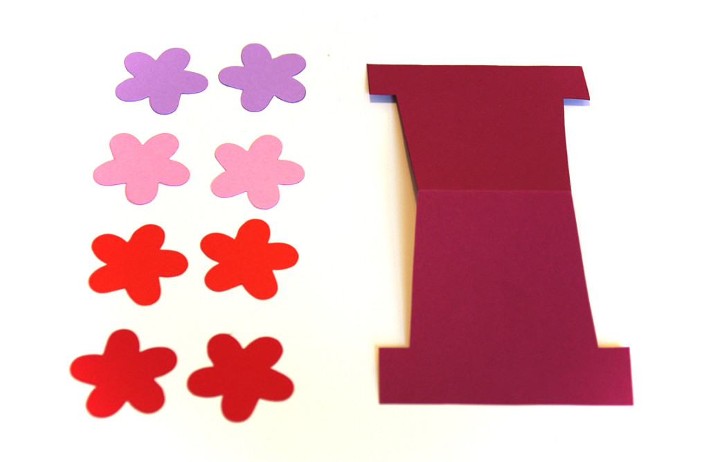 - Stampate il cartamodello in un foglio A4 e ritagliate le due sagome. Utilizzando poi le sagome come guida, ritagliate 2 fiori per ciascuno dei 4 colori di cartoncino.