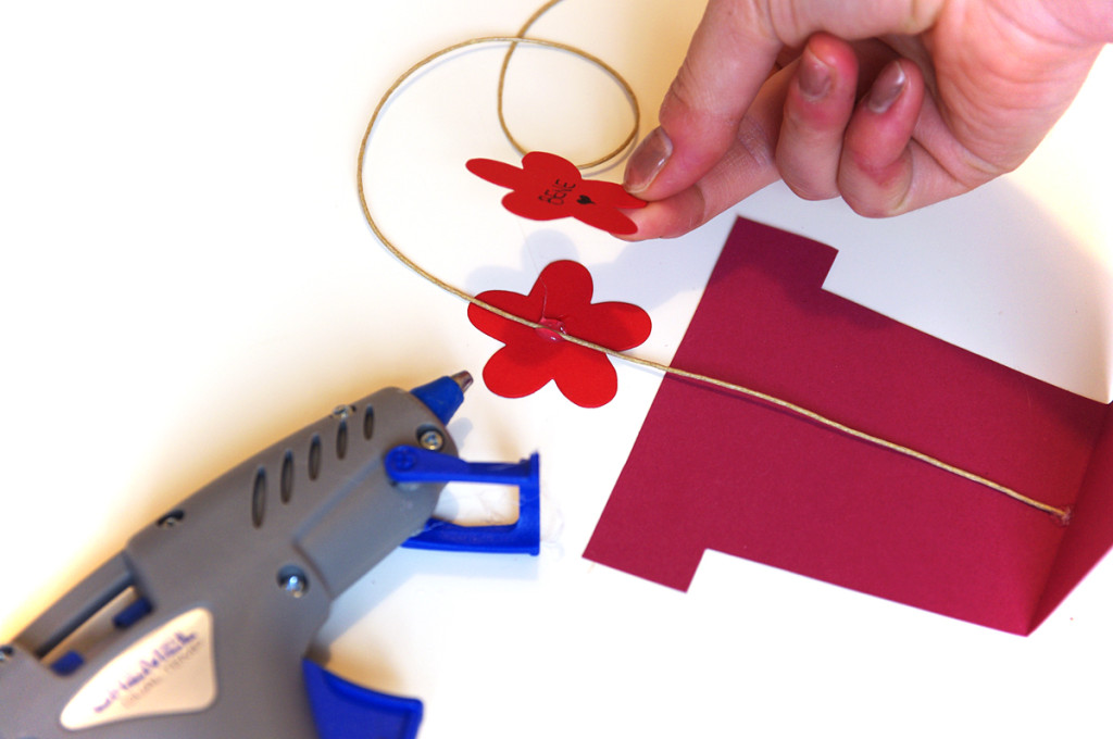 - Fate passare lo spago in mezzo tra due sagome di fiore dello stesso colore, mantenendo la parte con la scritta verso l’alto, e fissate con della colla a caldo.